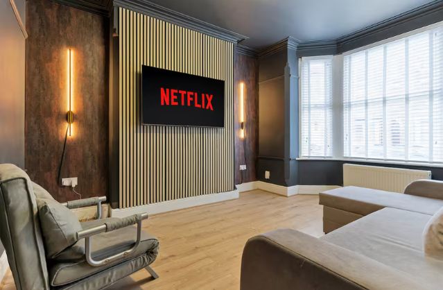 - Wall-mounted TV with Netflix